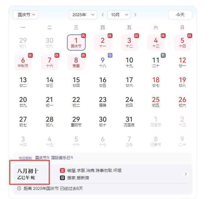 10月8日,国庆假期结束,有网友调侃元宝枫资本,想给祖国母亲再过一个生日。网友查询日历发现,1949年10月1日农历为八月初十,而2025年10月1日的农历也是八月初十。“看来不能再给祖国母亲过个阴历生日了,但这个巧合很浪漫!”网友表示。