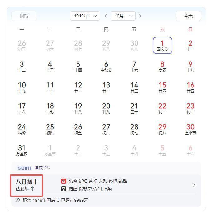 浪漫的重合不止于此,今年的寒露是10月8日,1949年的寒露同样是10月8日;今年中秋节是10月6日,1949年的中秋也是10月6日。